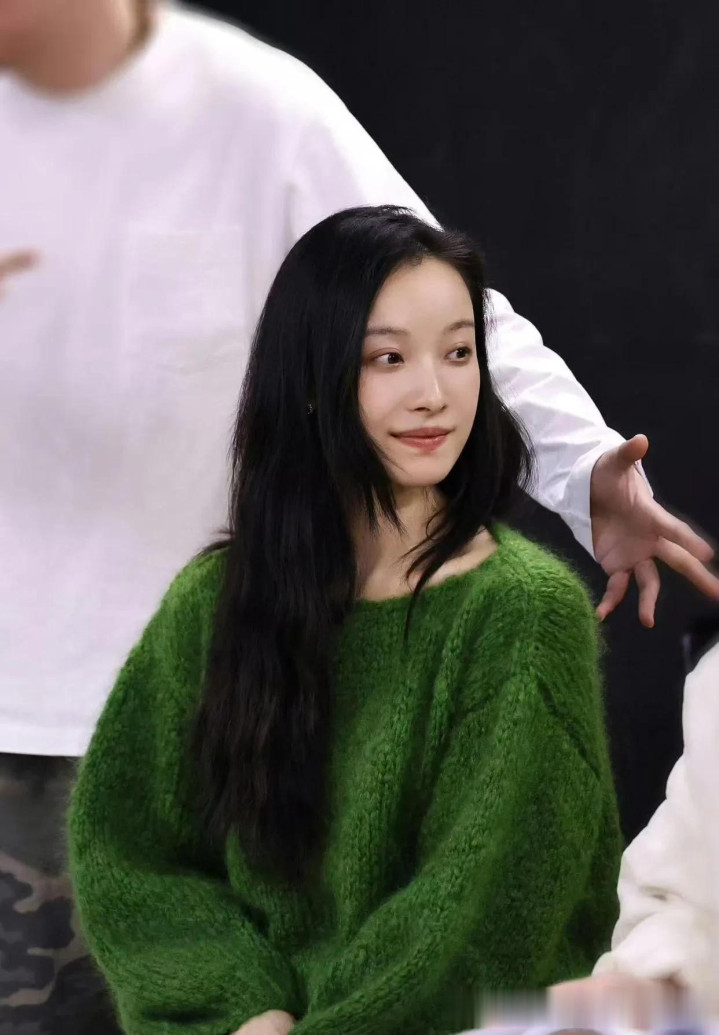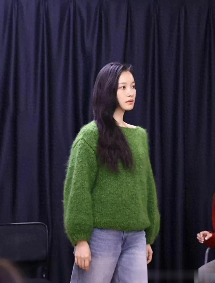 倪妮的气质真是出挑! 穿草绿色毛衣+牛仔裤, 时髦显白又减龄!